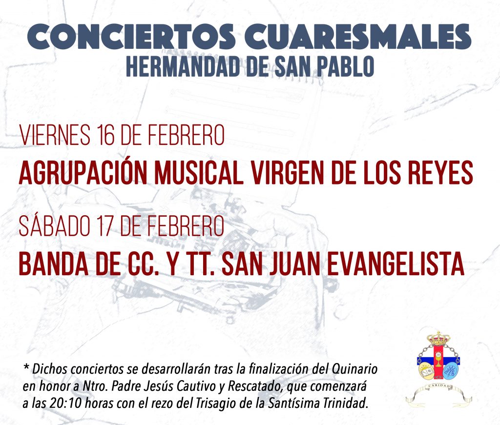 Durante la próxima Cuaresma se desarrollaran varios conciertos en nuestra parroquia de San Ignacio de Loyola. El próximo día 17 de febrero tendremos el gusto de escuchar a la Agrupación Musical Virgen de los Reyes. El sábado 17 de febrero nos acompaña la Banda de CC. y TT. San Juan Evangelista, que ya nos deleita cada Lunes Santo tras el misterio de Ntro. Padre Jesús Cautivo y Rescatado.
