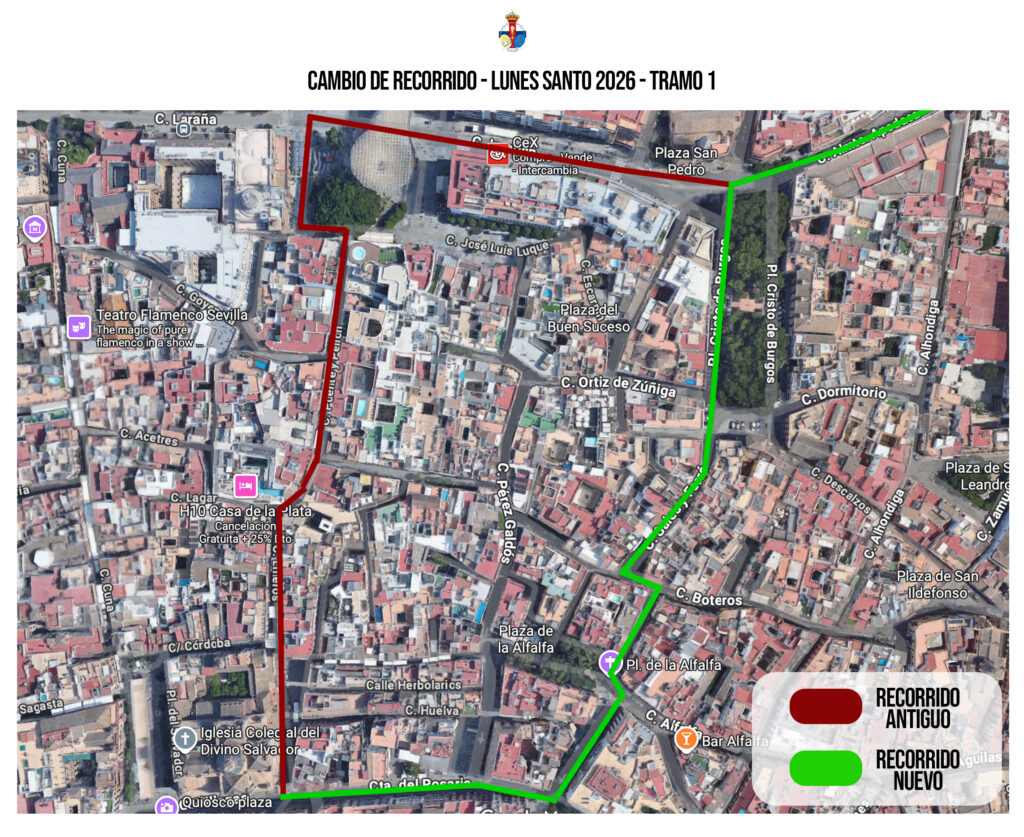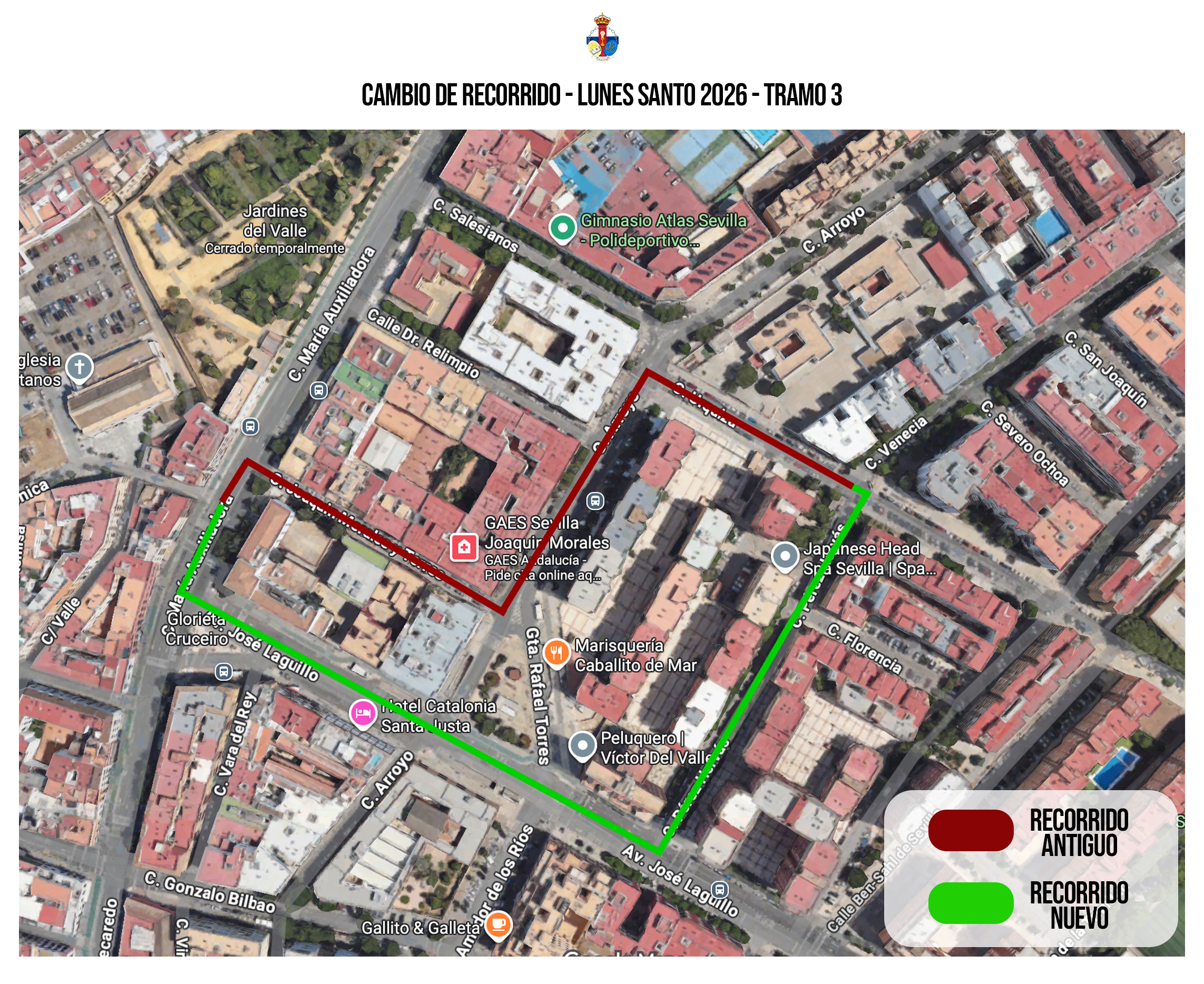 Se modifica el recorrido de la Hermandad desde la salida del Santuario de los Gitanos hasta la calle Venecia. El nuevo itinerario discurrirá por la calle María Auxiliadora, la avenida José Laguillo y la calle Pérez Hervás, enlazando nuevamente con la calle Venecia.