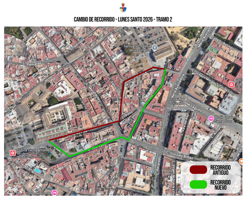 Queda suprimido el paso por las calles Escuelas Pías, Gallos, Butrón y Verónica. En su lugar, el itinerario de llegada al Santuario de los Gitanos se realizará por las calles Jáuregui y Valle.